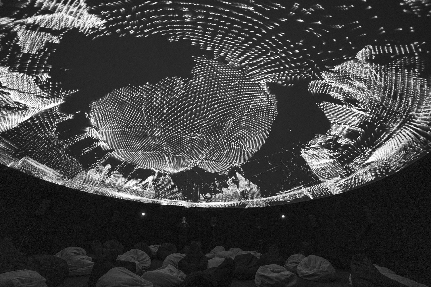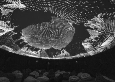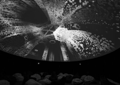 Every visual and sound element is processed in real-time, ensuring each performance is unique and responsive to the space. The spatialized sound and visuals wrap around the audience, creating the sensation of stepping into a parallel reality.